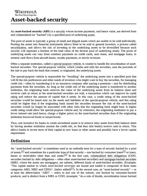 Hey everyone! Today, we’re diving deep into the world of asset-backed securities , or ABS for short. You’ve probably heard the term thrown around, especially in financial news, but what exactly are they, and why should you care? Well, guys, these financial instruments are pretty darn important in the grand scheme of lending and finance. Think of them as a way for companies to package up a bunch of loans and sell them off to investors. It’s a bit like bundling up a whole bunch of different kinds of fruit and selling them as a fruit basket – but instead of apples and oranges, we’re talking about mortgages, car loans, credit card debt, and all sorts of other receivables. The core idea behind asset-backed securities is securitization , a process where illiquid assets, meaning assets that aren’t easily bought or sold, are transformed into liquid securities that can be traded on the open market. This process unlocks capital for the originators of these assets, like banks or lenders, allowing them to issue more loans and stimulate economic activity. For investors, ABS offer a way to gain exposure to a diversified pool of assets and potentially earn attractive returns. However, as we all know, with great potential reward comes potential risk, and understanding the underlying assets and the structure of the ABS is crucial before jumping in. We’ll break down how they work, the different types you might encounter, and the pros and cons for everyone involved. So, buckle up, and let’s get this financial journey started!