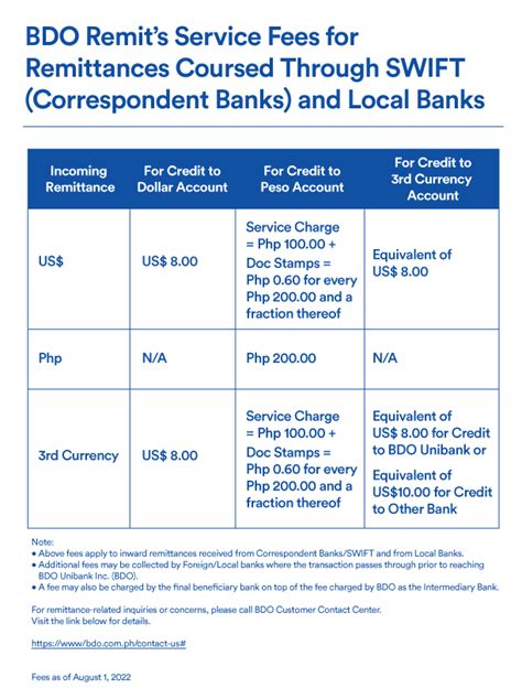Base Fees and Percentage Charges: BDO typically charges a base fee for international transfers, which is a fixed amount irrespective of the amount you are sending. This base fee can range from a few hundred pesos to a few thousand, depending on the destination country and the amount transferred. In addition to the base fee, BDO might also charge a percentage of the amount transferred. This percentage is usually a small fraction of the total amount sent. So, when calculating the total cost, you need to consider both the base fee and the percentage charge. The fees may also depend on the service you use, such as SWIFT or another international money transfer platform. Be sure to check the fee schedule before initiating a transfer. This will help you know exactly what you will be charged.