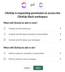 4. Grant Permissions: Review the permissions that ClickUp is requesting. Typically, it will ask for permission to post messages, access channel information, and manage integrations. Click “Allow” to grant these permissions.