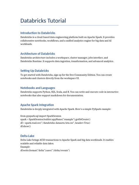 Now, let’s talk about getting your hands dirty with a Databricks tutorial PDF . Why a PDF, you ask? Well, they’re fantastic for offline reading, easy to print, and often provide a structured, curated learning path that’s perfect for beginners and intermediate users alike. They distill complex information into digestible chunks, making it easier to grasp key concepts. You can often find official documentation from Databricks themselves, which are usually top-notch. These guides are typically comprehensive and cover everything from basic setup to advanced features. Look for resources titled something like “Databricks Getting Started Guide,” “Databricks Fundamentals,” or specific guides on Spark, Delta Lake, or MLflow. These official PDFs are goldmines of accurate and up-to-date information. Many universities and online learning platforms also create their own Databricks tutorials in PDF format. These might be course materials, workshop guides, or cheat sheets. Searching specifically for “Databricks tutorial PDF download” or “free Databricks PDF guide” on your preferred search engine can yield some great results. Keep an eye out for reputable sources – blogs from established data professionals, university courseware, or official vendor documentation are usually the safest bets. Sometimes, you might find community-contributed cheat sheets or quick-start guides that are incredibly useful for quick reference. These are often condensed versions of more extensive tutorials, highlighting the most important commands and concepts. Don’t underestimate the power of a well-made cheat sheet when you’re trying to remember a specific syntax or workflow! Remember, the best tutorial for you will depend on your current skill level and what you want to achieve. Are you a complete beginner just trying to understand the basics of Spark on Databricks? Or are you an experienced user looking to dive deep into advanced ML pipelines? Tailor your search accordingly. A good PDF tutorial should ideally include: