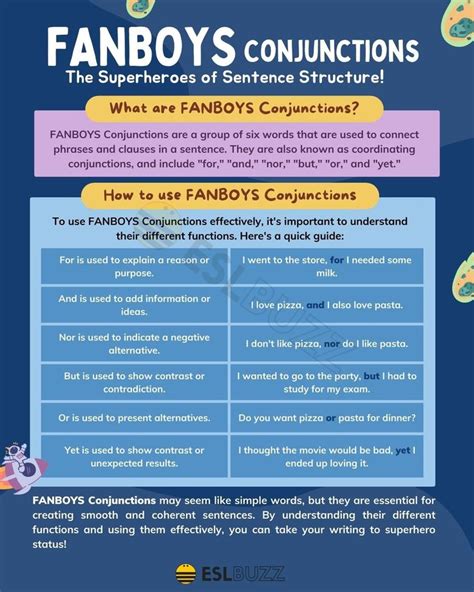 So, what’s the big deal about fanboys in English ? Let me tell you, they are super important for creating complex sentences. Fanboys is actually an acronym, a clever little trick to remember the seven coordinating conjunctions: F or, A nd, N or, B ut, O r, Y et, S o. These words are the superheroes of sentence structure, allowing us to join independent clauses (which are basically complete sentences on their own) to create longer, more sophisticated sentences. Think of it like building with LEGOs; these conjunctions are the special bricks that connect different structures, making something bigger and more interesting. Without them, our sentences would be short, choppy, and frankly, a bit boring. For example, instead of saying “I like pizza. He likes pasta,” you can say, “I like pizza, and he likes pasta.” See how much smoother that is? It’s not just about joining sentences, though. Fanboys can also join words or phrases, like “I need apples and oranges ” or “Should we go out or stay in ?” Understanding how to wield these little powerhouses is a fundamental skill for anyone looking to communicate clearly and effectively in English. They are the backbone of compound sentences, providing logical connections between ideas, whether it’s addition, contrast, choice, or consequence. Mastering their usage will dramatically improve your writing and speaking fluency, making your thoughts more cohesive and impactful. They are the unsung heroes of grammar, quietly ensuring our messages are conveyed with precision and style, allowing for nuance and complexity that simple sentences simply can’t achieve. So next time you see one of these seven words, give them a little nod of appreciation – they’ve earned it!