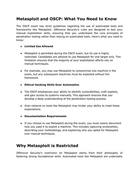 Alright, let’s unpack why Offensive Security puts these restrictions on Metasploit for the OSCP, guys. It all boils down to their core educational philosophy, which is all about building deep, foundational knowledge . They want to ensure that when you get that OSCP certification, you’re not just a script kiddie who knows how to run pre-built exploits. They want you to be a genuine penetration tester, someone who understands the mechanics behind the attacks. Think about it: Metasploit is an incredible tool because it abstracts away a lot of the complexity. It has thousands of pre-written exploits and payloads ready to go. This is fantastic for efficiency in the real world, but for a certification designed to prove fundamental skills, it can be a shortcut that bypasses critical learning. If you solely rely on Metasploit, you might never truly learn how a buffer overflow works, how to craft a shellcode, or how to manually exploit a SQL injection vulnerability. The OSCP exam is designed to put you in situations where these foundational skills are essential. They want you to be able to reverse-engineer the process, to understand why a certain exploit works and how to adapt it if it doesn’t work out-of-the-box. This means knowing how to manually identify vulnerabilities, understand the underlying protocols, and even write simple proof-of-concept exploits yourself. Using Metasploit extensively without this understanding is like knowing how to drive a car but having no idea how the engine works. You can get from point A to point B, but if something goes wrong, you’re stuck. The OSCP wants you to be the mechanic, not just the driver. They want you to be able to fix the car, build a new one, or understand it so well that you can predict its failure points. So, the restrictions aren’t there to make your life harder for no reason; they’re there to ensure that the certification signifies a genuine, hands-on understanding of penetration testing at a fundamental level. It’s about building real security professionals who can think critically and solve complex problems, not just operate tools.