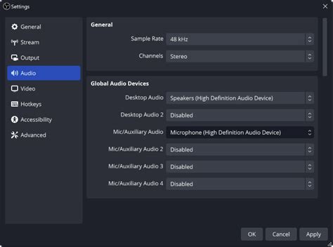 Pro-Tip: It’s generally recommended to set only one Desktop Audio device and one Mic/Aux device in these global settings. If you need to capture multiple desktop audio sources or have more complex audio routing needs, you’ll typically add them as separate ‘Audio Input Capture’ or ‘Media Source’ (for desktop audio) sources in your Scenes collection. We’ll get to that in a bit.