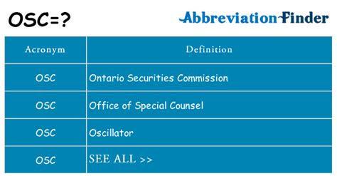 Beyond Open Sound Control and the Ontario Securities Commission , OSC can stand for a variety of other things, depending on the specific context. Let’s explore some of these additional meanings to give you a more comprehensive understanding. One common usage of OSC is for oscillators in electronics. An oscillator is a circuit that produces a repetitive electronic signal, often a sine wave or a square wave. Oscillators are used in a wide range of applications, from clocks and timers to radio transmitters and audio synthesizers. In the context of electronics, OSC might appear in circuit diagrams, technical specifications, or product descriptions. Another possible meaning of OSC is Operation Support Center . An Operation Support Center is a centralized location where IT professionals monitor and manage the performance of computer systems, networks, and applications. The OSC is responsible for detecting and resolving technical issues, ensuring that critical services are available and running smoothly. This meaning of OSC is commonly used in the IT industry. Furthermore, OSC can sometimes refer to Outside Counsel . Outside Counsel refers to lawyers or law firms that are hired by a company or organization to provide legal advice or representation on a specific matter. Unlike in-house counsel, who are employees of the company, outside counsel are independent contractors. In legal contexts, you might encounter OSC when discussing legal strategy or representation. To recap, while Open Sound Control and the Ontario Securities Commission are the most widely recognized meanings of OSC , it’s essential to consider the context in which the abbreviation is used. Whether it’s electronics, IT, or law, understanding the specific field will help you decipher the intended meaning of OSC accurately.