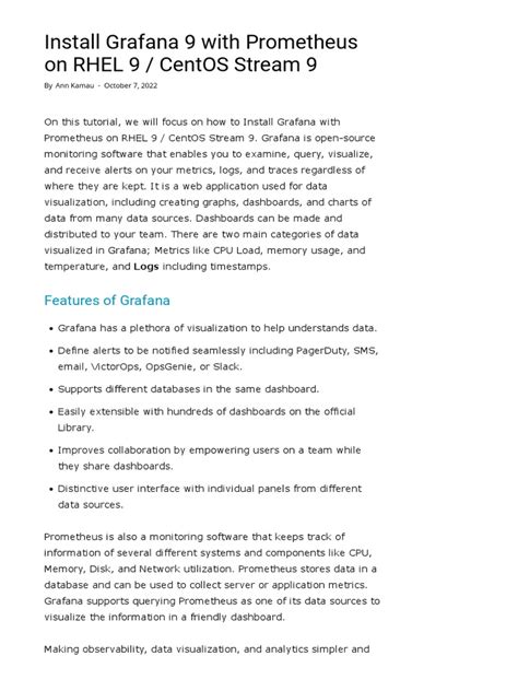 Before we jump into the fun part – installing Prometheus and Grafana on CentOS 7 – we need to make sure our server is prepped and ready to go. Think of this as laying the groundwork for a solid build. First things first, you’ll need a server running CentOS 7. This guide assumes you have root or sudo privileges, which are necessary for installing packages and configuring services. The most crucial prerequisite is ensuring your system is up-to-date. Open up your terminal and run these commands: sudo yum update -y . This will fetch and install all the latest security patches and software updates, which is super important for security and compatibility. Next, we need to install wget , a handy tool for downloading files from the web, if it’s not already installed. You can check by typing wget --version . If it’s not there, no worries, just run sudo yum install wget -y . We’ll be using wget to download the Prometheus and Grafana packages. We also need to ensure that the firewall isn’t blocking our access to Prometheus (default port 9090) and Grafana (default port 3000). If you’re using firewalld (which is common on CentOS 7), you’ll want to open these ports. You can do this with the following commands: sudo firewall-cmd --permanent --add-port=9090/tcp and sudo firewall-cmd --permanent --add-port=3000/tcp . After adding the ports, remember to reload the firewall: sudo firewall-cmd --reload . It’s also a good practice to have curl installed, as it’s useful for testing network connectivity and API endpoints. If curl isn’t present, install it with sudo yum install curl -y . Finally, for Prometheus to effectively scrape metrics, your target applications or systems need to expose those metrics in a format Prometheus can understand, usually via an HTTP endpoint. While this isn’t strictly a server-side prerequisite for Prometheus itself , it’s vital for the overall monitoring setup. We’ll touch on this more later, but for now, just know that your monitored targets need to be ready to be monitored. By taking these simple steps, you’re setting yourself up for a smooth installation of Prometheus and Grafana on CentOS 7 . Let’s get rolling!