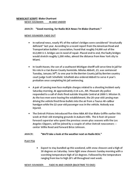 Live reports are the heart-pounding, adrenaline-fueled segments of any newscast. They put the audience right in the middle of the action. These scripts are unique because they need to be flexible and adaptable . You might have a general outline of what you want to cover, but you also need to be prepared for unexpected developments or spontaneous interviews. The script often includes talking points rather than word-for-word text, allowing the reporter to speak more naturally. For example, a live report script for a protest might have bullet points like: Current crowd size and mood , Key protest demands , Interview with protest organizer , Police presence and response , Update on any disruptions . You’ll also see cues for when to hand back to the studio anchor: (HANDBACK TO STUDIO) . The challenge with live reporting is managing your time effectively and staying on message, even when things get chaotic. It requires quick thinking, clear communication, and the ability to improvise. A good live script will also anticipate potential questions or points of confusion and address them proactively. It’s about painting a picture for the viewers at home, giving them a sense of immediacy and authenticity. These segments are often the most memorable parts of a broadcast because they feel raw and unscripted, even though there’s a great deal of planning and preparation behind them. The success of a live report often hinges on the reporter’s ability to connect with the environment and the people present, translating that experience into a coherent and informative segment for the viewers. It’s a high-stakes environment where clear communication and rapid decision-making are essential for success.
