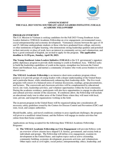 Hey everyone! Are you ready to dive into an incredible opportunity? Let’s talk about the Spring 2023 YSEALI Academic Fellowship ! This fellowship is a game-changer for young leaders from Southeast Asia, and in this guide, we’ll break down everything you need to know. From eligibility to application tips, we’ve got you covered. This is your chance to gain invaluable experience, expand your network, and develop leadership skills that will last a lifetime. So, grab your coffee, get comfortable, and let’s explore the world of the YSEALI Academic Fellowship! We’ll cover what it is, who can apply, the benefits, the application process, and some insider tips to make your application shine. This fellowship offers a unique chance to study in the United States, focusing on a specific theme related to civic engagement, environmental issues, or social entrepreneurship. The program is designed to empower young leaders and equip them with the tools and knowledge to make a real difference in their communities. It’s more than just an academic experience; it’s a chance to build connections, learn from experts, and explore American culture. The fellowship includes academic coursework, cultural activities, community service, and opportunities to network with professionals in your field. Think of it as a launchpad for your future, a stepping stone to achieving your goals, and a chance to make lifelong friends. The Spring 2023 program is highly competitive, so understanding the requirements and preparing a strong application is crucial. Let’s get started and make sure you’re well-prepared to take on this amazing opportunity!