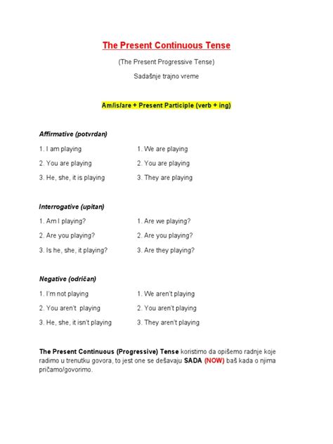 Alright, let’s break down how to actually build this tense, guys. It’s actually pretty straightforward once you get the hang of it. The basic structure involves using the present tense of the verb ‘to be’ (which is am , is , or are ) followed by the main verb in its present participle form. What’s a present participle, you ask? Easy peasy – it’s just the ‘-ing’ form of the verb! So, you take your verb, chop off the ‘-e’ if it has one (like ‘write’ becomes ‘writing’), or just add ‘-ing’ to the end (like ‘play’ becomes ‘playing’). Combine that with the right form of ‘to be’, and boom! You’ve got your present continuous. For example, if the subject is ‘I’, you’ll use ‘am’ – “I am eating lunch.” If it’s ‘he’, ‘she’, or ‘it’, you use ‘is’ – “He is reading a book,” “She is watching TV,” “It is raining .” And for ‘we’, ‘you’, and ‘they’, it’s ‘are’ – “We are studying hard,” “You are talking too much,” “They are playing outside.” The spelling rules for adding ‘-ing’ are usually simple: just add ‘-ing’ to the base form. However, there are a couple of minor exceptions. For verbs ending in a silent ‘e’, you usually drop the ‘e’ before adding ‘-ing’, like make becomes making , love becomes loving . For verbs that end in a consonant-vowel-consonant pattern (and are stressed on the last syllable), you often double the final consonant before adding ‘-ing’, like run becomes running , stop becomes stopping , and swim becomes swimming . Don’t worry too much about memorizing every single rule right now; practice makes perfect! The key takeaway is the formula: Subject + am/is/are + Verb-ing . Mastering this structure is your first big step towards confidently using the present continuous tense in your everyday conversations. It’s the foundation upon which all your ‘happening now’ sentences will be built, so give it some practice and you’ll be a pro in no time!